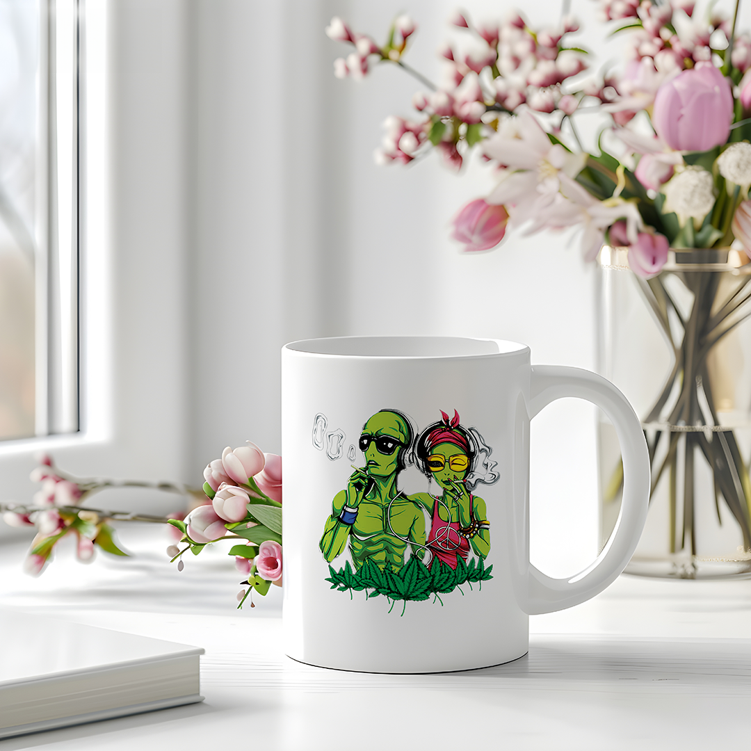 Crafted with high-quality ceramic, this mug features a whimsical and imaginative design of an otherworldly being leisurely enjoying a smoke. With its bold colors and intricate details.